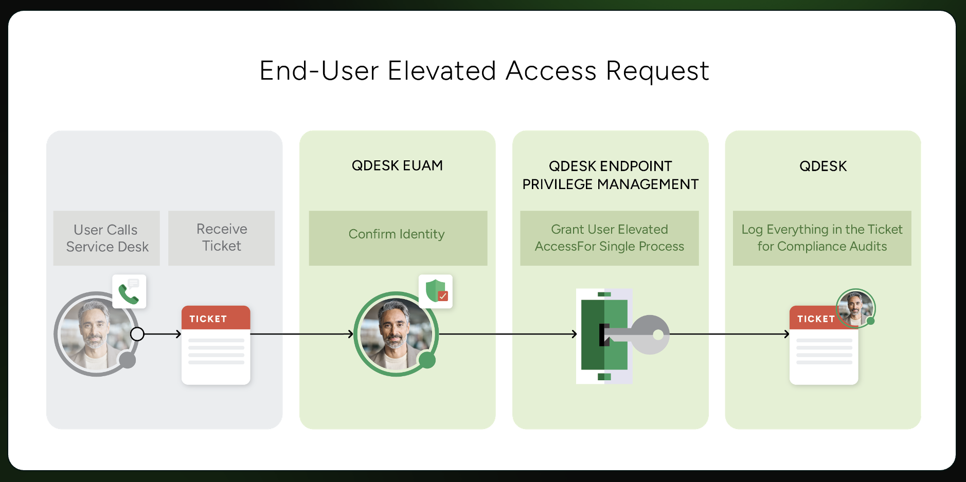 A secure end-user elevation workflow treats privilege as a controlled, identity-verified process, not a standing entitlement. Every elevation request begins with identity confirmation, ensuring the person requesting access is who they claim to be before any privilege is granted. Access is scoped to a single task or time sensitive process, and is automatically revoked when the job is complete. Eliminating persistent admin rights on the endpoint.
